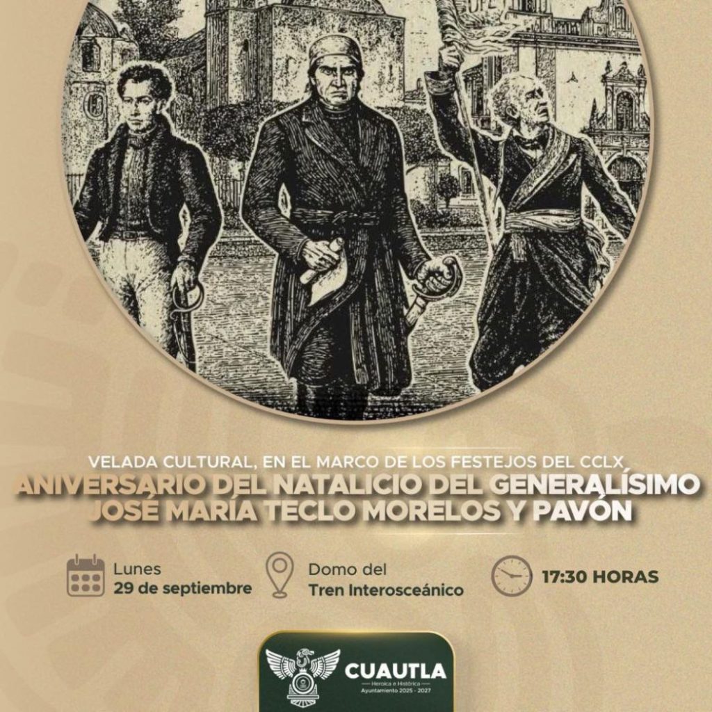 Cuautla, Mor.-El Ayuntamiento de Cuautla, que encabeza el alcalde Jesús Corona Damián, tiene el honor de invitar a la ciudadanía a la tradicional Velada Cultural, en el marco de los festejos por el CCLX aniversario del natalicio del Generalísimo José María Teclo Morelos y Pavón.