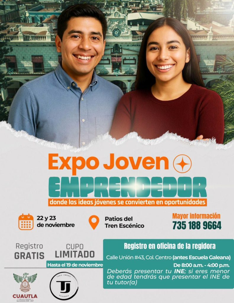 Cuautla, Mor.-El Ayuntamiento de Cuautla, encabezado por el alcalde Jesús Corona Damián, a través de la regidora Tania Jiménez Ortega, invita a las y los jóvenes a participar en la Expo Joven Emprendedor 2025, que se llevará a cabo los días 22 y 23 de noviembre en el Tren Escénico de Cuautla.