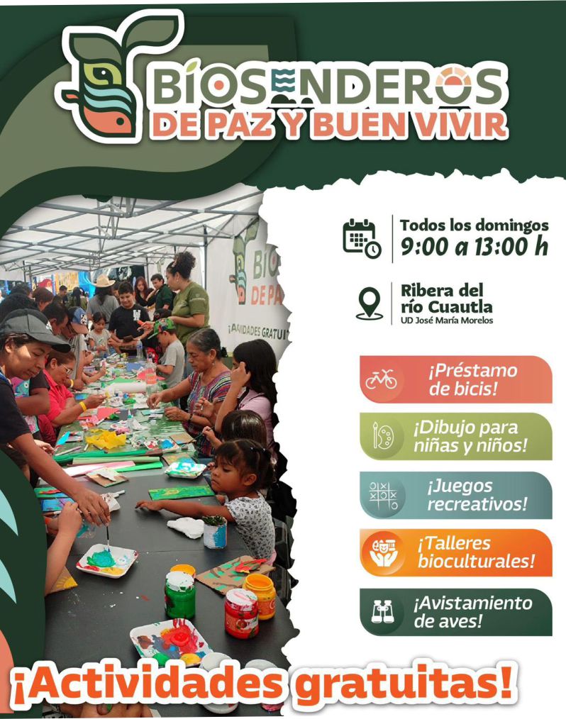 Cuautla, Mor.-El Ayuntamiento de Cuautla, encabezado por el alcalde Jesús Corona Damián, invita a la ciudadanía a “Biosenderos de Paz y Buen Vivir”, una actividad que se lleva a cabo todos los domingos en la ribera del río Cuautla, organizada por la Dirección de Protección Ambiental en coordinación con la Secretaría de Desarrollo Sustentable, con el objetivo de promover la educación ambiental, el cuidado de la biodiversidad y la convivencia comunitaria. Durante la jornada, las familias podrán participar en un talleres bioculturales, juegos, dibujos, recorrido en bicicleta y avistamiento de aves. Las actividades se desarrollan de 9:00 a 13:00 horas, con acceso totalmente gratuito.
