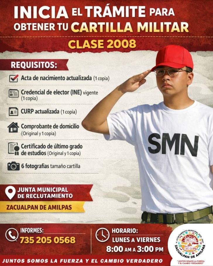 Zacualpan, Mor.-El Ayuntamiento de Zacualpan de Amilpas que encabeza Marino Santibáñez Alonso informó que continúa disponible el trámite para obtener la Cartilla del Servicio Militar Nacional, dirigido a los jóvenes de la Clase 2008. Este documento es un requisito fundamental para diversos trámites oficiales, por lo que se les invita a acudir y realizar su registro en tiempo y forma. Estarán atendiendo de Lunes a viernes, de 8:00 a.m. a 3:00 p.m. Es importante presenta la documentación requerida y da el primer paso para cumplir con tu deber cívico. Para más información llamar al 735 205 0568.