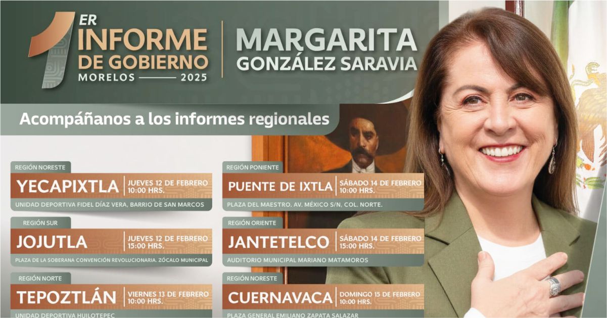 Cuernavaca, Mor.-En el marco de su Primer Informe de Gobierno, la gobernadora Margarita González Saravia anunció una gira por las siete regiones del estado para presentar avances y resultados de…